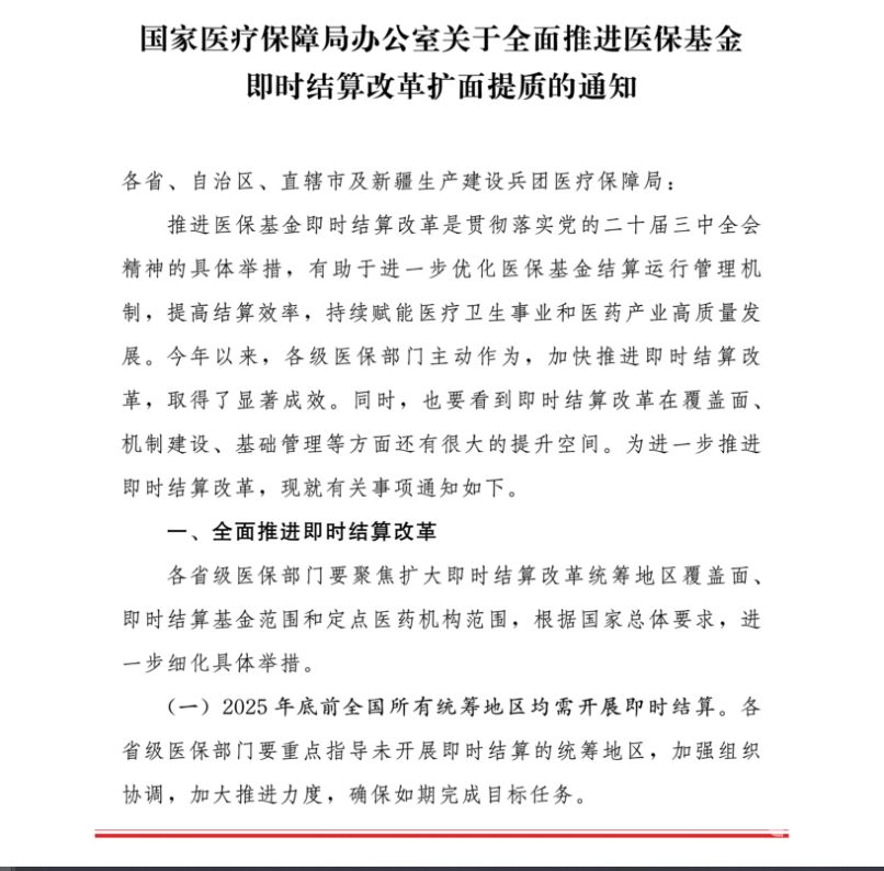 10月16日,國(guó)家醫(yī)保局辦公室發(fā)布了《關(guān)于全面推進(jìn)醫(yī)保基金即時(shí)結(jié)算改革擴(kuò)面提質(zhì)的通知》。